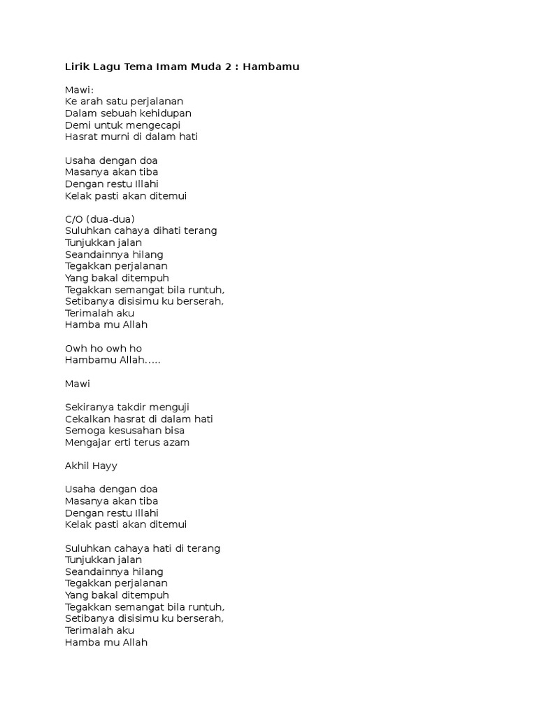 Setibanya di sisiMu ku berserah. Mengajar erti terus azam. Lirik Lagu Tema Imam Muda 2 Pdf Lirik Lagu Hambamu Pdf Hambamu Mawi Feat Akhil Hayy Lyrics Youtube Mp Pta Negeri Perak Jaipk Jom Hayati Lirik Lagu Ini Hambamu Allah Allah Lagu Lirik wallpaper.